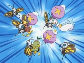 Un grupo de Beautifly choca contra los Drifloon que llevaban por los aires a Pikachu y sus amigos.
