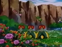 Poco después de nacer Larvitar, Ash se empeña en mostrarle la belleza de la vida, ya que el Pokémon se mostraba temeroso e inseguro. Cuando Ash le acompaña al exterior, Larvitar puede ver varios Bellossom y Jumpluff, tan comunes en Johto.