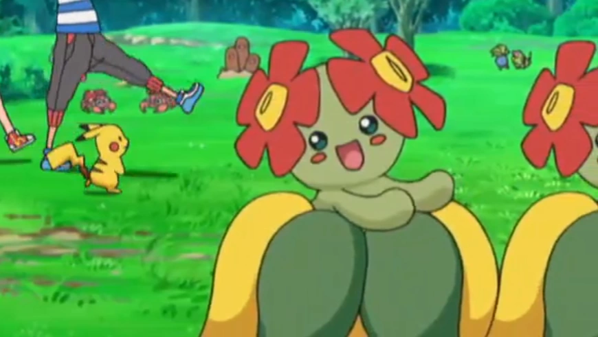 Se ven a tres Bellosom bailando en el rancho del profesor Oak durante la visita de Ash y sus compañeros de Alola.