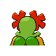 Su cuerpo es de color verde, su cabeza está adornada por dos flores con los pétalos de color rojo y con su centro amarillo. A su vez, su cuerpo está cubierto de hojas verdes y amarillas unidas entre sí a modo de falda.