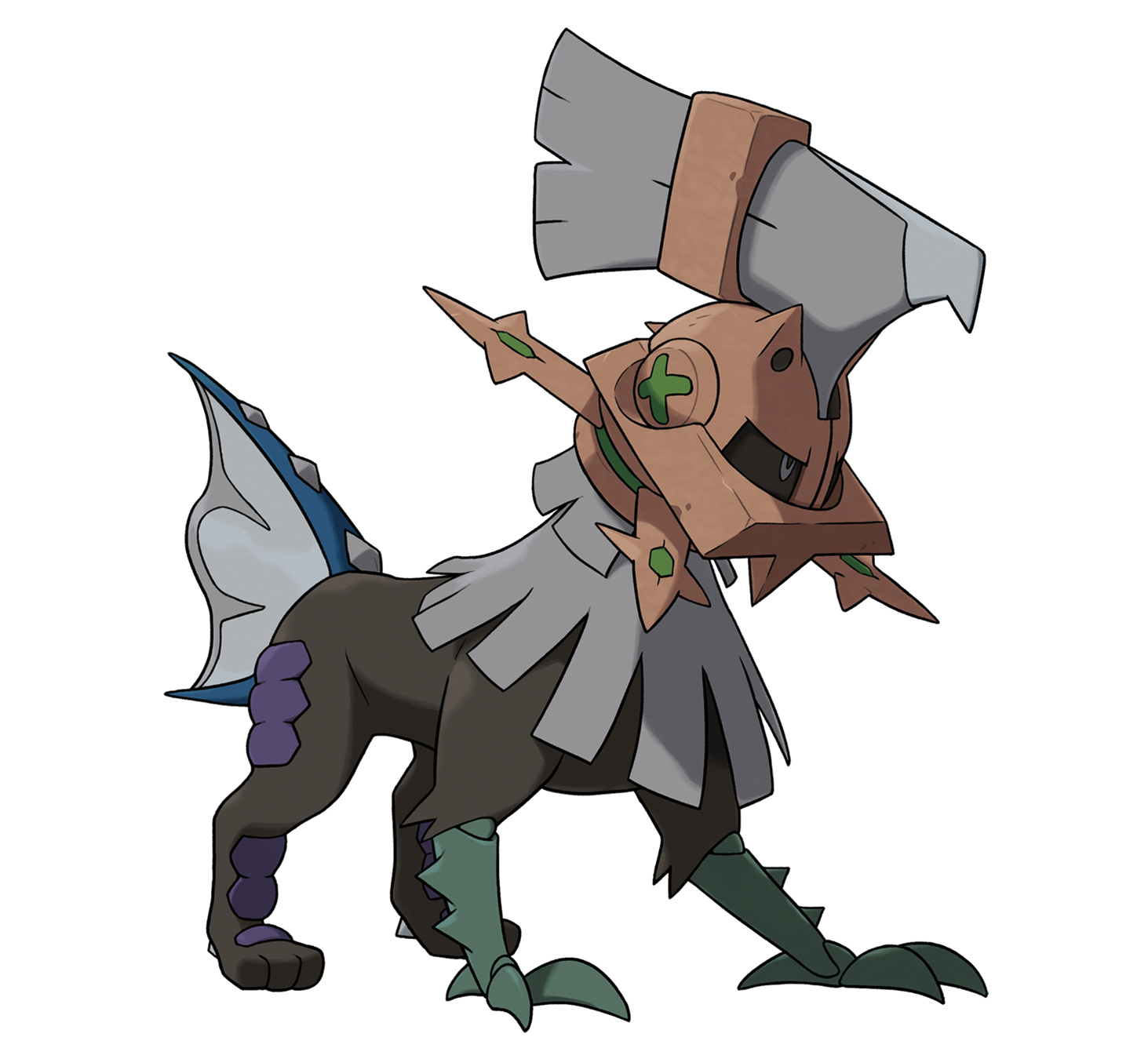 La máscara que le cubre la cabeza está diseñada para mantener bajo control su poder latente, aunque es muy pesada, por lo que entorpece sus movimientos. Parece ser que para superar con éxito cierta misión, se requería la ayuda de un Pokémon capaz de hacer frente a Pokémon de leyenda.
