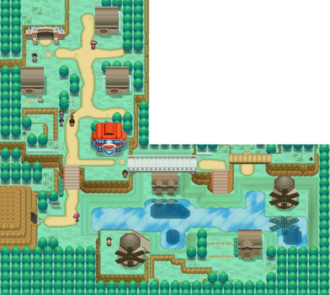 La mayoría de los edificios se encuentran en zonas altas, debido al clima húmedo de esta zona y por los montones de charcos que contienen Pokémon salvajes, al sur de la ciudad también se pueden encontrar varios molinos de viento.