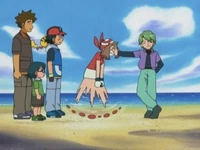 En el episodio de la octava temporada, Un Arcanine en las alturas (ES) / En la nube de Arcanine (HA) ‹№› aparece entrenando con su Flygon y le muestra a May/Aura que tiene 1 listón/cinta de la región Kanto en su poder.