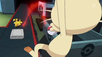 Clemont inventa una maquina para abrir la puerta y poder escapar, pero explota, aunque sí cumple su objetivo al llevarse la puerta por delante en la explosión. Jessie y James se dan cuenta de eso y advierten a Meowth. Pikachu para defenderse atrapa a Meowth dentro de una Lujo Ball, aunque Meowth escapa con la maleta y huye con Jessie y James en un camión. Ash encuentra a Pikachu y cuando salen de la fábrica se encuentran con el camión y le ordena a Pikachu que le lance un Atactrueno para voltearlo.