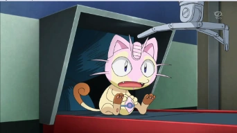 - Meowth es metido en una Lujo Ball por el Pikachu de Ash para defenderse.
