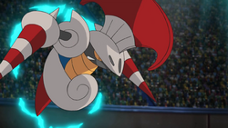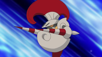 | Pokédex de Ash | EP725 | ES: Escavalier, el Pokémon soldado y forma evolucionada de Karrablast. El cuerpo de Escavalier está protegido por una armadura de acero. |