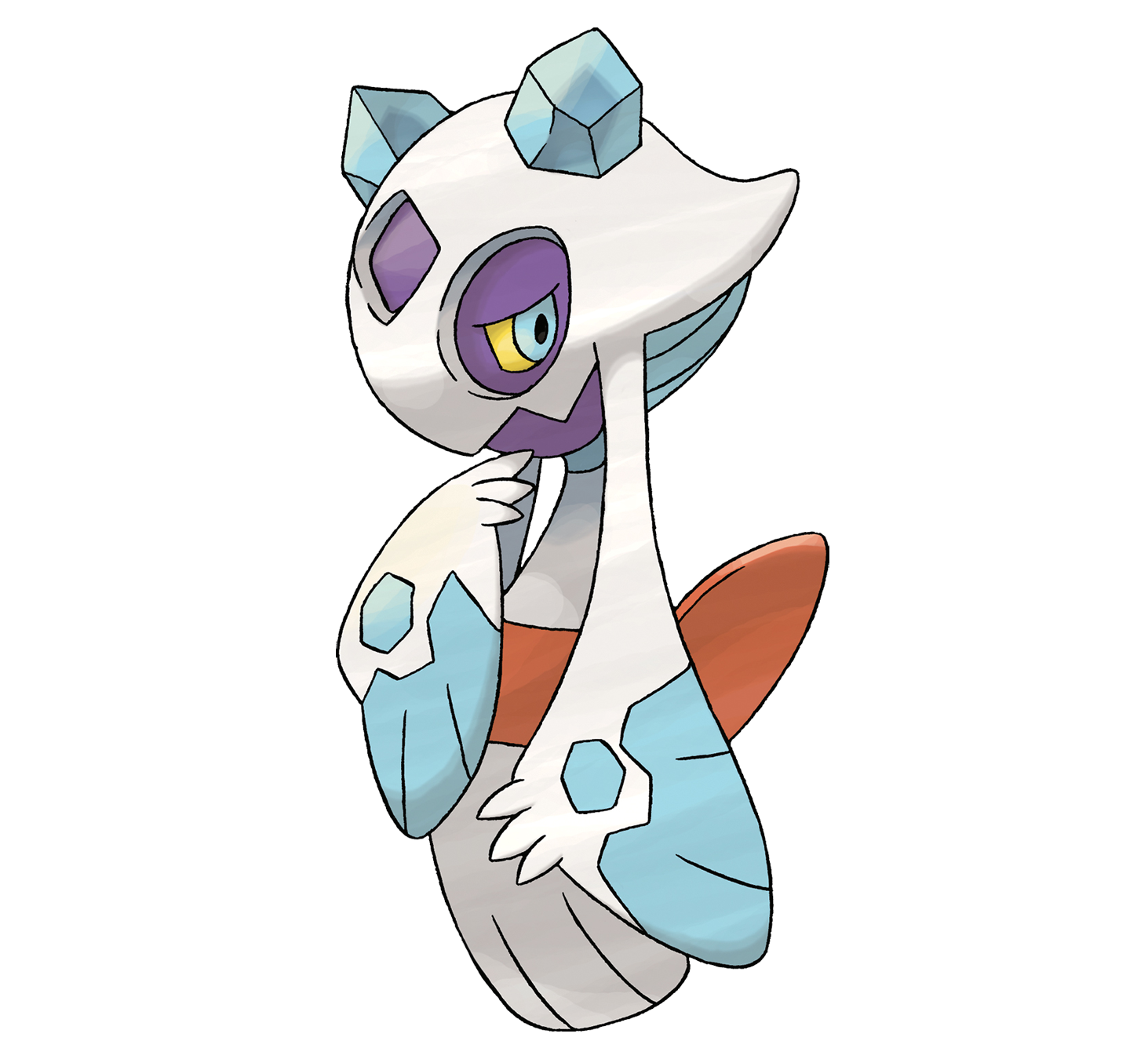 Este Pokémon posee unos pálidos brazos congelados en el antebrazo, su abdomen está enrollado en una cinta roja con un lazo en la parte posterior y tiene un par de cristales de hielo en la cabeza.