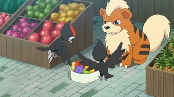 Este Growlithe que se encontraba comiendo en la calle no tiene problema en compartir su comida con los Pikipek salvajes.