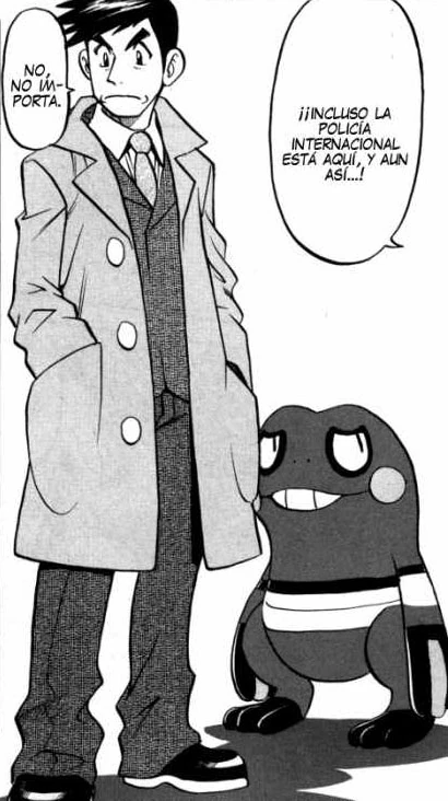 - «¡Magnífico! ¡Si, si, si! ¡Lo que me habías dicho es cierto! ¡Espléndido! ¡Pese a tu corta edad, muchos quisieran entrenar como tú! ¡Muy bien hecho! ¡Voy a dar caza a esos maleantes! Me han soplado que la guarida del Equipo Galaxia se halla en Ciudad Vetusta. ¡Debo partir hacia allí!»