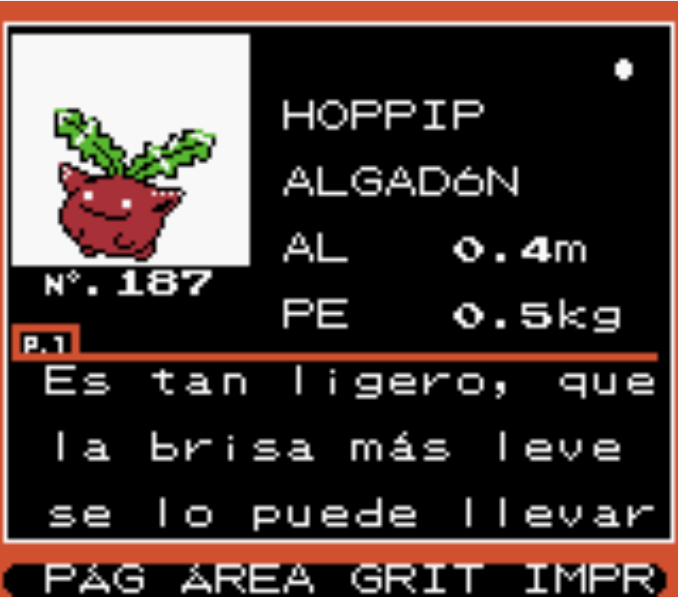 | Rubí | Este Pokémon flota en el aire y se deja llevar. Cuando percibe que el viento va a cambiar a fuerte, Hoppip entrelaza sus hojas con otros Hoppip para hacer resistencia y evitar salir volando por la fuerza de la corriente. | |