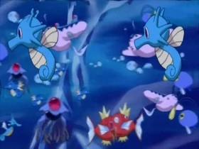 Mientras el Team/Equipo Rocket planea su golpe a la Zona Safari, donde pretenden volar el lago con dinamita para encontrar a Dratini, se imaginan el resultado. En lo que se puede ver como uno de los Pokémon que saldría a la superficie por la explosión sería un Horsea.