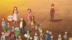 Aparece junto a su entrenadora viendo los resultados finales de la primera ronda de la Liga de Kalos.