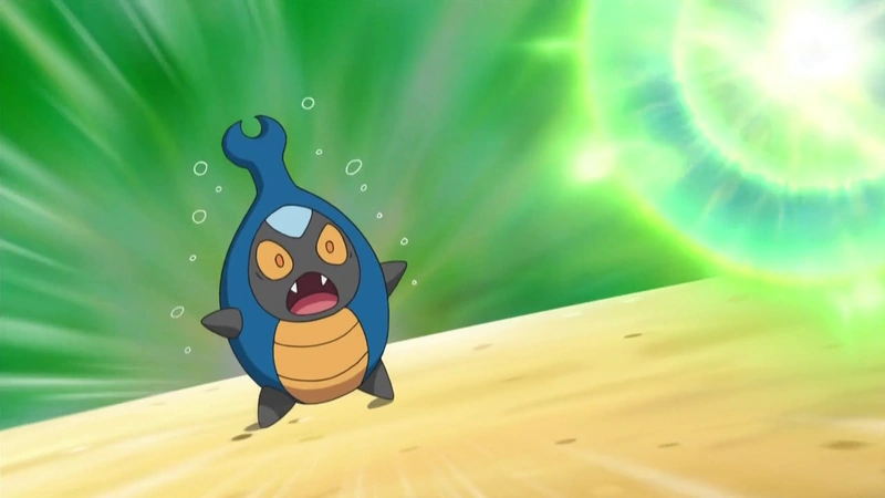 | Pokédex de Ash | EP725 | ES: Karrablast, el Pokémon bocado. Karrablast vive en bosques y campos, y se oculta en árboles o bajo la hierba cuando se ve amenazado. También se defiende escupiendo ácido. |