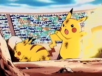 Pikachu tiene un combate contra el Raichu de Lt. Surge en Competición de descarga eléctrica (ES) / Duelo eléctrico (HA) ‹№› donde es totalmente superado por éste, dejando gravemente herido en el Centro Pokémon. Ahí mismo, la Enfermera Joy le obsequia a Ash un piedra trueno para que Pikachu pueda evolucionar en Raichu y así poder derrotar a Lt. Surge, pero Pikachu se negó a hacerlo. Pikachu tuvo su revancha el día siguiente contra Raichu, esta vez saliendo victorioso al usar su velocidad superior en su beneficio.