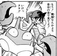 - Sería un personaje secundario (paralelo a Blasco) al cual los escritores del Pokémon manga especial pensaban en darle el papel de Emerald pero al final creyeron que no tenía el carácter adecuado para tener el papel de este personaje. Antes era un chico enfermizo al que le pidió a Norman que le entrenara pero él se rehusó a hacerlo porque no quería empeorar su enfermedad. Más tarde Rubí, al ver que su padre no lo quería ayudar, le prestó su Ruru (Ralts) para capturar a su primer Pokémon Kecleon aunque justo después de capturarlo se creó una grieta en el suelo y Blasco se quedó con el Ruru de Rubí. Para curar su enfermedad se fue a Pueblo Oromar porque con su aire limpio era más fácil curarse. Mientras él estaba curándose allí obtuvo una mascarilla para respirar mejor. Se encontró con la Pokédex que mas tarde sería de Emerald y el Treecko que se convertiría en el Sceptile de Emerald y, cuando ocurrió la guerra de Groudon y Kyogre, Norman apareció para prometer entrenarle llevándoselo al Pilar Celeste y, junto con sus Pokémon, lo subió hasta la cima para retarle a un combate. Con la ayuda de éste invocaron a Rayquaza. En su última aparición se veía que devolvía la Pokédex al profesor Abedul y a Rubí le devolvía su Ralts (evolucionado en Kirlia) y escribió una carta donde declaraba haber perdido a Treecko (evolucionado en Grovyle). Su equipo Pokémon es Kecleon, Cacturne, Roselia y Flygon.