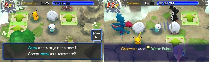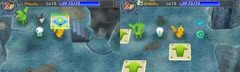 - Habrá 2 tipos de tablones de misiones y 2 puertas, en el tablón de la izquierda se realizarán las misiones que consistirán en vencer a líderes con sus equipos, para las que partirás con un único Pokémon, y a la que podrán unirse otros jugadores abriendo la comunicación local si estás en modo compañero; en la de la derecha están las misiones de todo tipo que realizarás con el equipo que tu elijas. Cada vez que Azumarill acepte nuestras misiones, abrirá una puerta para que nos lleve directo a la mazmorra. La puerta que abre depende del tablón del que hemos elegido la misión.