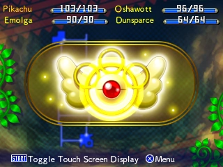 con tres aros. Cuando pasan muchos turnos en cualquier mazmorra, dicho medallón comienza a brillar y podemos realizar un Ataque de Grupo, que consiste en un ataque a todos los Pokémon que están alrededor. Dependiendo del Pokémon que inicie el Ataque de Grupo el efecto será diferente. A continuación, algunos detalles sobre los Pokémon principales: