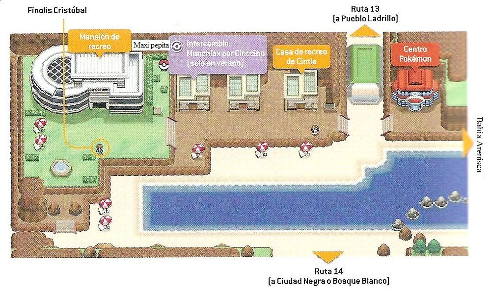 En él puedes retar a Cintia1, en la residencia de Catleya, una casa que se encuentra a la izquierda del centro Pokémon. En este pueblo hay tres casas; una a la izquierda del centro Pokémon (la de Catleya) y otras dos que solo será posible encontrar personas en verano. En una de ellas podrás intercambiar un Cinccino por un Munchlax.