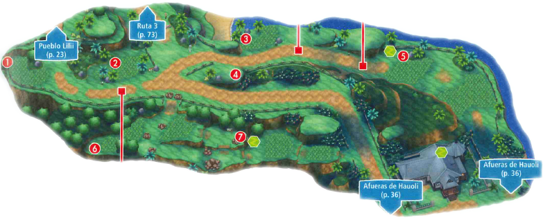 La Ruta 1 es un camino frondoso y repleto de vegetación al este de Melemele. Esta ruta oculta varios secretos, pero no podrás descubrirlos todos durante tu primera visita, así que te tocará volverla a explorar más adelante. Síguela y te conducirá a Pueblo Lilii por el norte y a las Afueras de Hauoli por el sur.