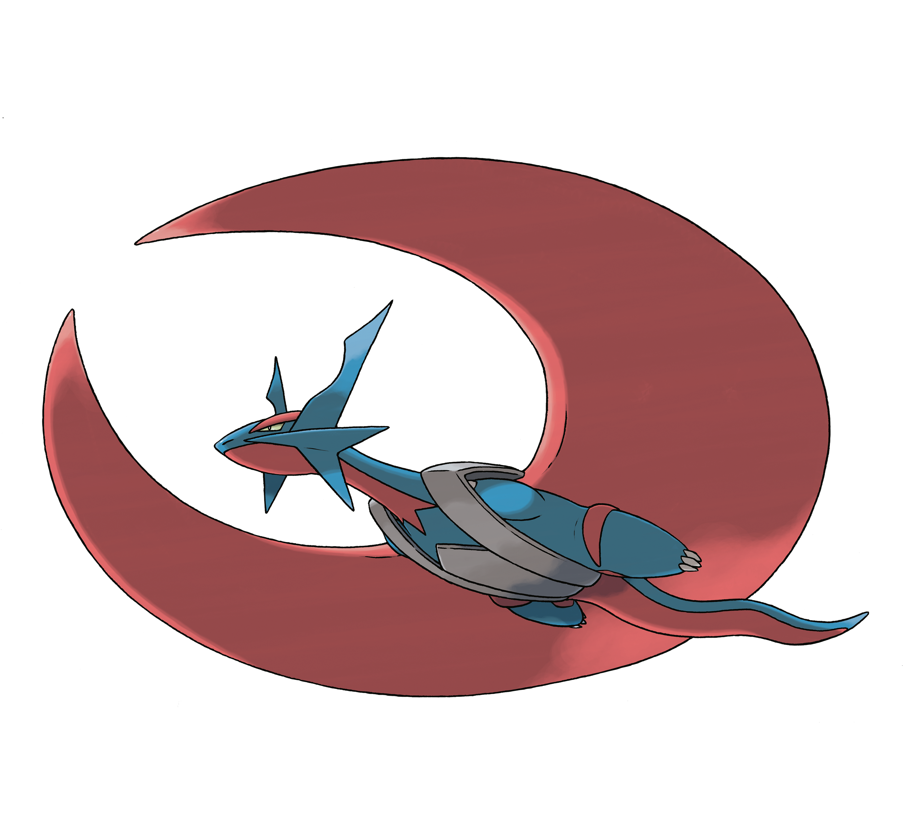 La energía de la megaevolución de Salamence se concentra en sus alas. Las dos se funden en una sola mucho más grande con forma de media luna. Cuando vuela a gran velocidad, el ala hace las veces de hoja afilada rebanando todo lo que se interponga a su paso. Sus patas se hacen más pequeñas y se esconden en su armadura, los cuernos de su cabeza aumentan ligeramente de tamaño, sus ojos se vuelven amarillos, y su altura y peso aumentan un poco. Esta forma más aerodinámica y especializada en el vuelo le permite incrementar sustancialmente su velocidad, y la coraza que parece cubrir su torso le dota de una defensa más reforzada respecto a su forma original.