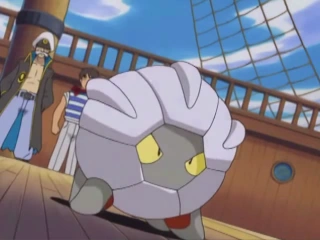 Se ve a un Shelgon en la zona de juegos del barco junto a muchos otros Pokémon.