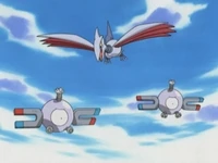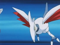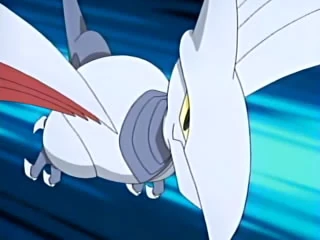 Cuando Delibird cae, genera una caída de nieve sobre este Skarmory, el cual se molesta y manda a volar a los pokémon del Team/Equipo Rocket.