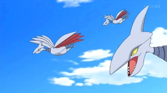 Mientras dormía, el Gible de Iris por accidente cayó sobre este Skarmory provocando su ira.