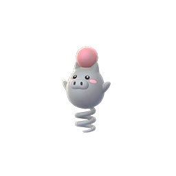 Spoink es un Pokémon con cuerpo de cerdo que posee una cola grande en forma de resorte, con una perla rosa en la cabeza, la cual es de extrema utilidad para este Pokémon. Generalmente son muy alegres.
