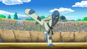 En ¡Puntuando para la final del Clubombazo! (ES) / ¡En busca del Clubultimate! (HA) ‹№› Stephan y Sawk se ofrecieron a ayudar al Scraggy de Ash, para perfeccionar su onda certera, mientras Montgomery y Throh los observaban de lejos.