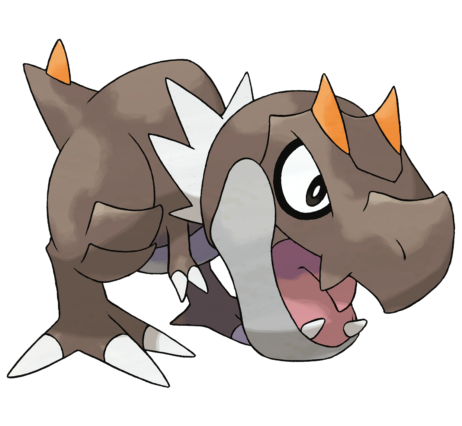 Se le caracteriza por su potente mandíbula gris que lo despedaza todo. Tiene dos pequeños cuernos en la cabeza en forma de triángulo de color naranja y unos grandes ojos de color negro. También tiene los dientes muy afilados y una especie de collar blanco en punta. Al final de la cola tiene otro cuerno naranja de la misma forma. Sus brazos son muy pequeños en comparación con sus grandes patas y garras.