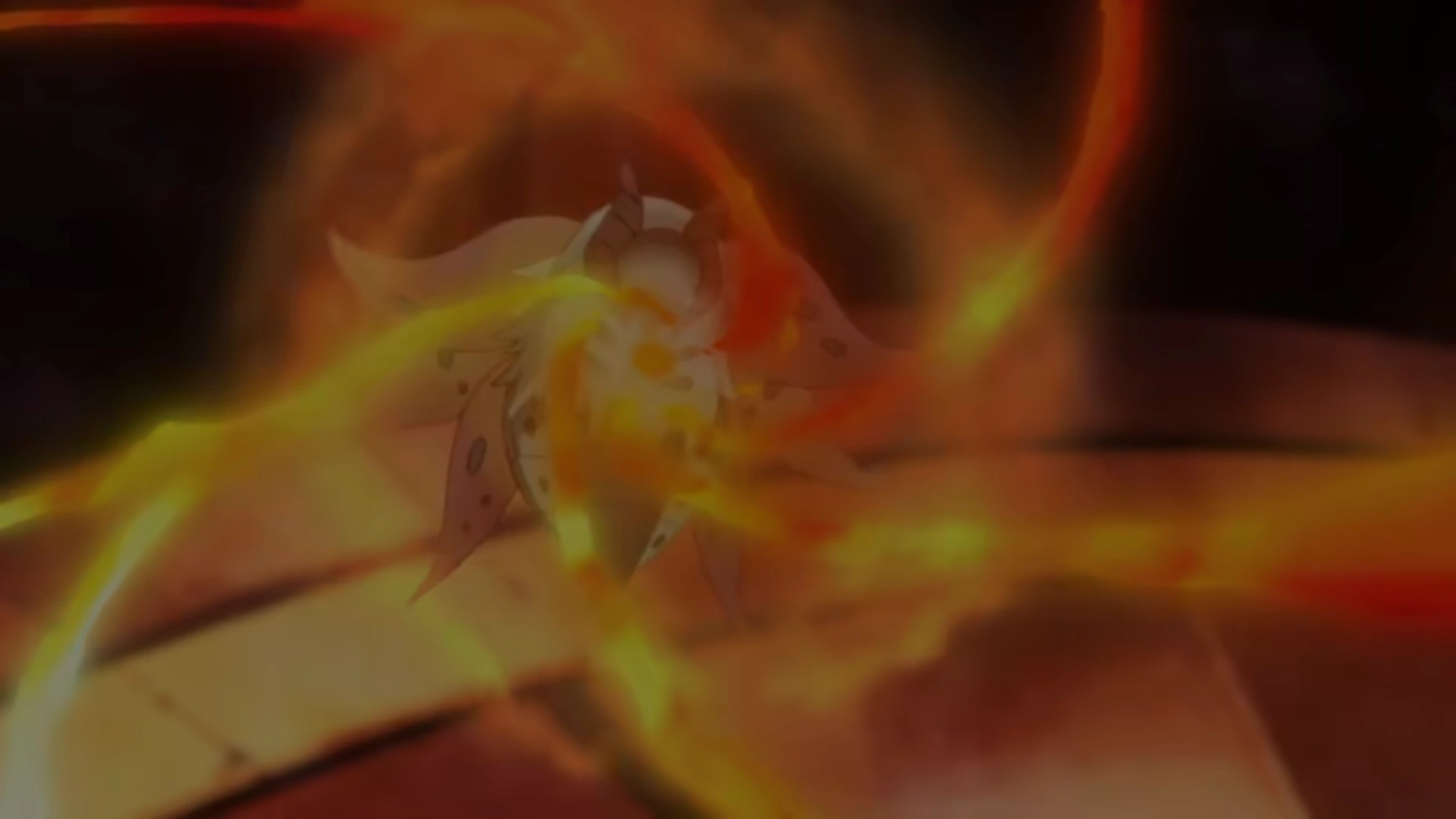 | Pokédex de Ash | EP740 | ES: Volcarona, el Pokémon sol y forma evolucionada de Larvesta. Se dice que cuando la ceniza de una erupción volcánica oscureció el cielo, el fuego de Volcarona reemplazó al sol. |