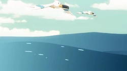 Ash, Iris y Cilan/Millo ven una bandada de Wingull y algunos Wailord desde un avión rumbo a Pueblo Undella/Arenisca.