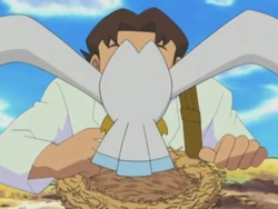 El profesor Birch/Abedul se encontraba investigando el nido de un Wingull, entonces en ese momento aparece el Wingull que vivía allí y lo picotea para que se aleje.
