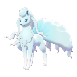 Ninetales, Forma Alolańska. Pokémon Lis. Typ Lodowy i Baśniowy. Ninetales ma łagodne usposobienie. Najczęściej dzieli swój teren zamieszkania ze strażnikiem wyspy. Istnieją podejrzenia, że jego wygląd jest uwarunkowany obecnością strażnika.