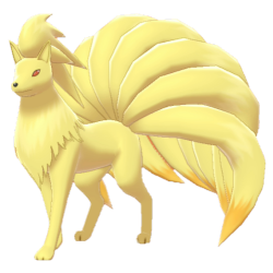 Ninetales, Pokémon Lis. Ewoluuje z Vulpixa. Ma dziewięć ogonów i grube, złote futro. Mówi się, że Ninetales żyje tysiąc lat.