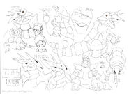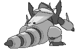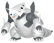 Aggron are highly territorial, claiming entire mountains as their own. They are very protective of their mountains, going to great lengths to keep them safe. Most obviously, this means fending off intruders that attempt to trespass on their land. However, Aggron will also plant trees, divert streams, or rearrange boulders to clean up their domains. In particular, lone Aggron have been known to restore areas ravaged by rockslides and wildfires back to their former glory without any outside help. Their ages can be measured by the lengths of their horns. One can also estimate how many battles an Aggron has fought in by the number of scars it bears on its metallic hide. They are very proud of their scars, showing them off as mementos of their conquests. Aggron use their horns to dig deep into bedrock in search of iron. Their digging will often expose new veins of iron for Aron and Lairon to consume. Though Aggron will relentlessly thrash those who deface their environments (such as miners and loggers), they will leave travelers who treat the land with respect alone. An extravagant Aggron-shaped helmet was discovered in a recent archaeological dig site, suggesting that Aggron were a popular heraldic element for ancient royalty.