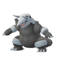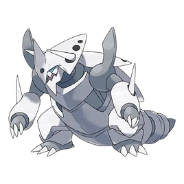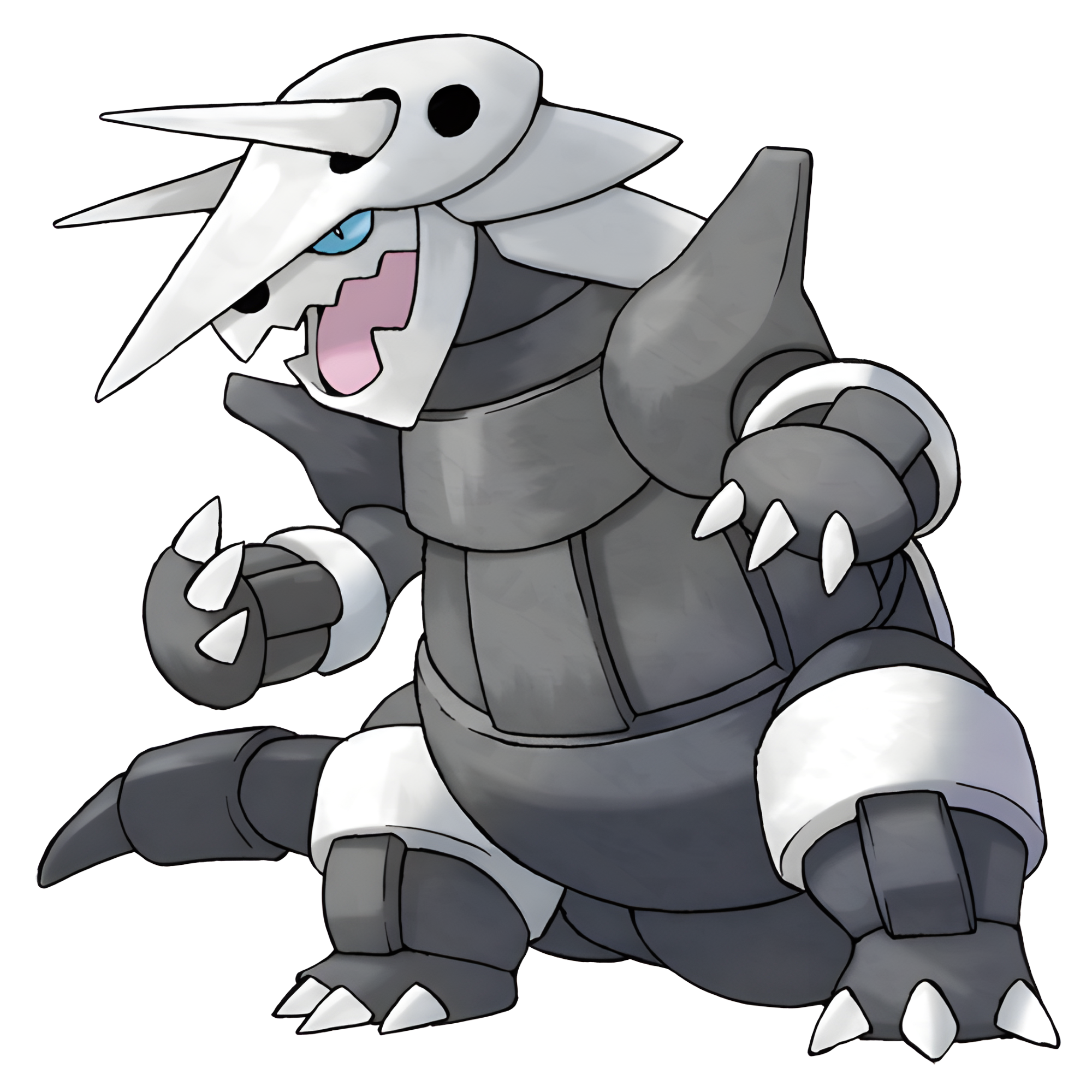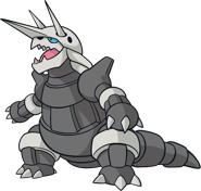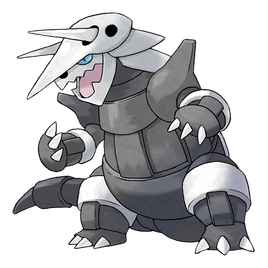 Aggron is best described as a monster. It bears a dark gray dragon-like appearance with iron plates over its entire body, horns over its eyes and claws; this Pokémon was built for battle. Some say that it looks partially like a castle wall.
