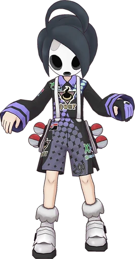 Allister is a short and slender young boy with pale skin and purple eyes. His black hair is fairly short, but with a few long strands in the front and a long curved cowlick at the back. On his face is a white mask with large holes for his eyes and mouth with motifs that looks similar to Corsola's motifs on the sides. His outfit consists of a long-sleeved black shirt and shorts. Around the ends of the sleeves are rings of light purple— a pair on each one, and on the right sleeve is the Galar league symbol. His shirt has a purple and gold upside-down triangle on the front with a black and gold spirit-like shape in the middle. This same symbol also re-appears on his right pant leg. Around the neck of the shirt are two light purple collar folds. His shorts and shirt share a light purple dot-like pattern, and on the left pant leg are two symbols — the numbers "291" and green Xs. Extending from Allister's upper waist to his shoulders are two white suspenders, reuniting behind him in a Cursola's face intersection and on his left hand is a purple glove with black fingertips. On his feet are white and black shoes with ruffles on the top.