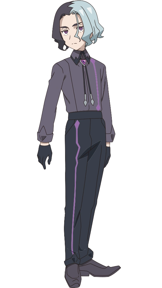 Amethio is a young boy with purple eyes. Along with his black and silver hair color, he wears black pants with a purple stripe on his right side. He also wears a dark purple sweatshirt with a purple stripe going down his left side, black gloves, and dark purple shoes. His attire is donned with a polo tie with a dark purple triangular gem.