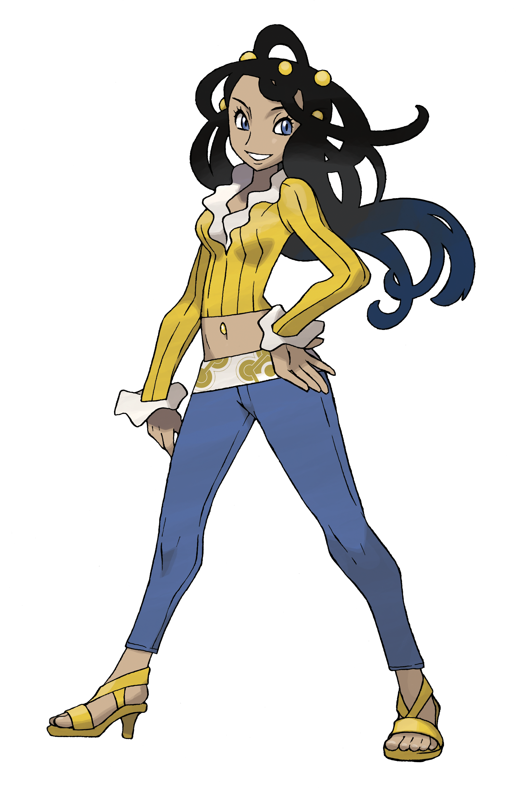 Dahlia is a slender woman with tan skin, blue eyes, and wild black hair with many yellow hair pins in it. She wears a midriff-baring yellow top with long sleeves and lacy white trim around her neck and cleavage, along with blue skinny jeans and yellow high heels. She also has trimmed, sparkling nails and a golden navel piercing.