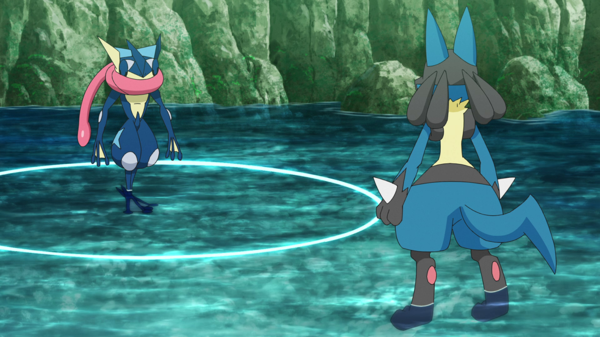 A Pokémon who used to travel with Ash during his journey in Kalos, Lucario originally sought Greninja out to help get stronger. Upon seeing the resonance between the Ninja Pokémon and its trainer, Lucario became furious at the level of power Greninja had compared to itself. After a humiliating defeat during his training, Greninja helped Lucario maintain a perfect balance with his bond towards Ash and demonstrated him by using the ripples in the water.