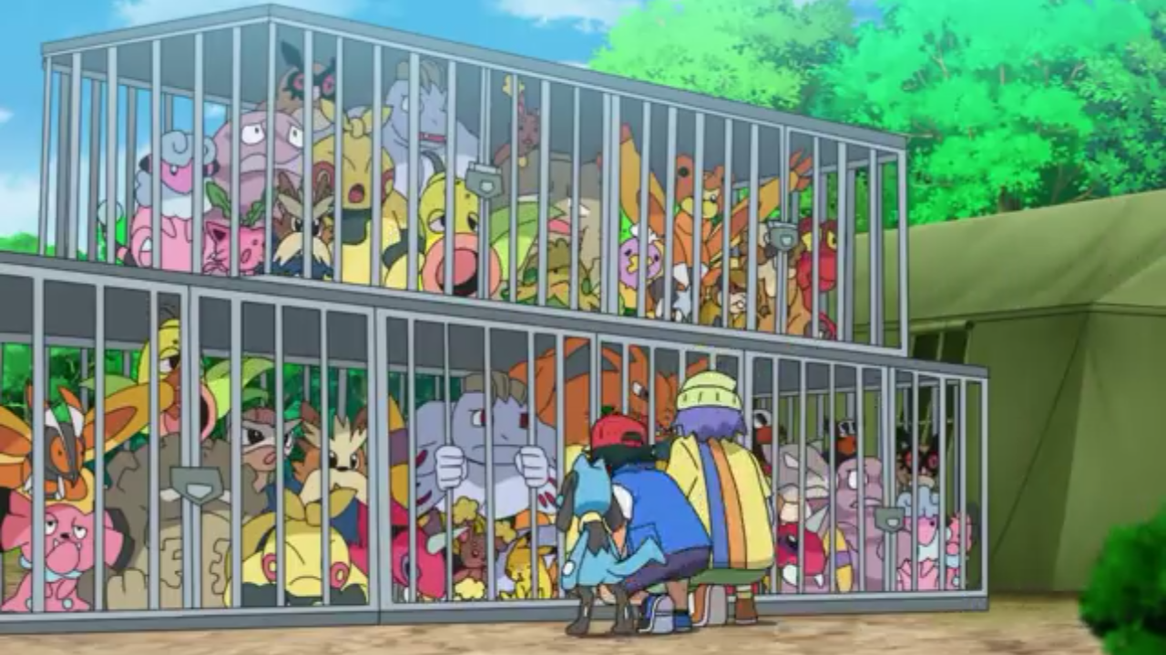 Riolu helping Ash rescue Pikachu and the other Pokémon from Team Rocket.