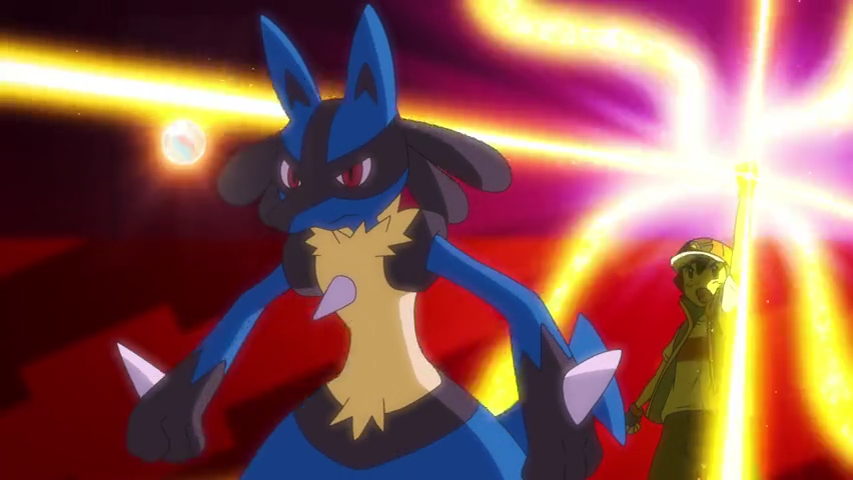 Lucario and it's Trainer Ash preforming Lucario's Mega Evolution for the first time.