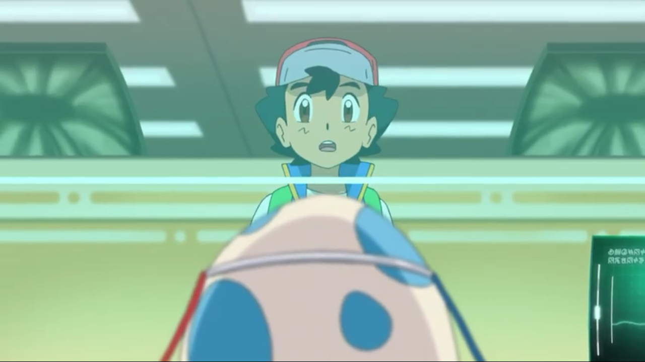 Ash looking at an egg in the Pokémon Center.