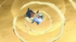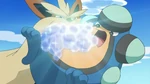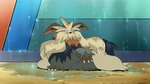 Burgundy sends Stoutland and Ash his Palpitoad, surprising everyone, as this is Palpitoad's first battle. Palpitoad starts with Mud Shot, hitting Stoutland, who tackles it back. Stoutland attacks with Thunder Fang, but it has absolutely no effect, due to Palpitoad being half Ground type Pokemon. Next, Stoutland uses Ice Fang, freezing Palpitoad. Palpitoad uses Supersonic, freeing itself. Stoutland tackles Palpitoad and goes to attack with Flame Fang, but is negated due to Mud Shot. Palpitoad attacks with Hydro Pump, defeating Stoutland and winning the round. Ash praises Palpitoad, making the others impressed, though Trip calls it a lucky break.