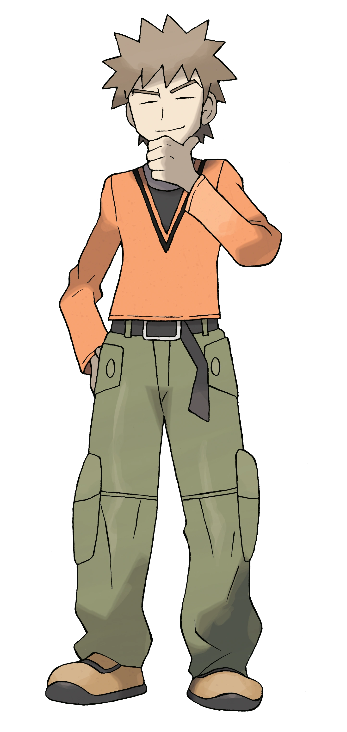 Brock is a teenager with brown hair and his eyes naturally appear closed. In Red and Blue, he was shirtless and wears a pair of blue jeans and black shoes. In Yellow, Brock wears a red vest with a black T-shirt with white short sleeves, blue jeans, and sneakers. In Gold and Silver, he wears a long-sleeved orange shirt with black lining over a black v-neck shirt and green pants.