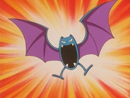 Before he evolves into Crobat, Golbat was the only Pokémon who resisted the Queen's control made by Jessie and countering her control powers from the Queen's rod by using Supersonic. As Team Rocket escapes the premises with the Queen's artifacts, Golbat tries to chase them in air while being aided by Ash's Noctowl but Team Rocket manage to activate their rocket in a full speed. Golbat becomes desperate to chase them as Brock sees this and he loudly cheered him on as he evolved into a Crobat much to everyone's surprise and Brock's excitement and stating that his Crobat can catch Team Rocket now. Crobat flew faster to stop Team Rocket from escaping and used its Wing Attack to destroy their rocket and also protect the Queen's artifacts, forcing both Jessie and James to fight it, only to be blasted off by Pikachu's Thunderbolt.[4]