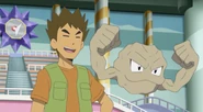 When Brock returns to Pewter City in Grating Spaces!, Geodude along with Flint's Golem and both Brock's Steelix and Crobat to reunite with Brock. After Max reveals to them that Meowth (Team Rocket) is stealing the Gym's Pokémon which Forrest recognizes it while it was lying that he hasn't stole anything. Forrest angrily releases Geodude to tackle Meowth on the ground revealing its motives of stealing. Brock was furious to see Team Rocket is responsible for remodelling the Gym where they pose as Gym remodellers calling them a disgrace while Forrest also became angered from their actions for stealing the Gym's Pokémon is was unforgivable challenging them to a fight. Geodude uses Sandstorm to keep them at bay while teaming up with Brock's Steelix by deflect both Aggron and Charizard's attacks which they are owned by Butch and Cassidy. Steelix hits Aggron with Iron Tail while Geodude hits Charizard's gut with Mega Punch. Team Rocket is soon blasted off by Ash's Pikachu and Donphan's Thunderbolt and Hyper Bean combination followed by Brock's Steelix's Dragon Breath and Geodude's Sandstorm. After the incident, Brock's family along with Brock's Pokémon waved goodbye to Ash and his group.