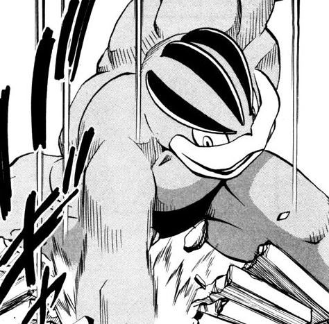Vulpix and Electabuzz attempted to attack Hitmonchan and Hitmonlee. However, Bruno had Hitmonchan and Hitmonlee used Comet Punch and Rolling Kick, which pushed Electabuzz and Vulpix to the edge of Onix, nearly making them fall down. When Yellow and Blaine attempt to break through the barrier around the battleground, Bruno had Onix attack them. He claimed others could only watch the battle, but not interfere. Bill saw no weaknesses in Bruno's Pokémon, while Lt. Surge noticed the Machamp had Machoke's belt, thinking it evolved recently. Lt. Surge and Bill fled from Bruno, dropping two Poké Balls on their way. The two were cornered by Machamp and Bruno promised to show no mercy to cowards. However, Bill and Lt. Surge actually lured Bruno into a trap, in which Lt. Surge activates his Electrode's Self-Destruct in conjunction with Exeggcute's Egg Bomb, proceeding to send a huge explosion rippling throughout the battleground. As Bruno fell down, Lt. Surge had four of his Magneton create a platform, on which he, Bill and their Pokémon could rest, preventing their fall in the acid lake, unlike Bruno's.[17] As Lt. Surge sought Bill's help to get out of the acid pool, Hitmonlee entwined its leg around him, dragging him back down. Bruno actually stood on Hitmonlee, and was saved from the fall. Bruno became enraged, as his Hitmonlee extended its legs and crashed Lt. Surge's Magneton. However, everyone was surprised when Red arrived, whose Saur used Vine Whip to pull Lt. Surge up, preventing his fall into the acid lake.[18]