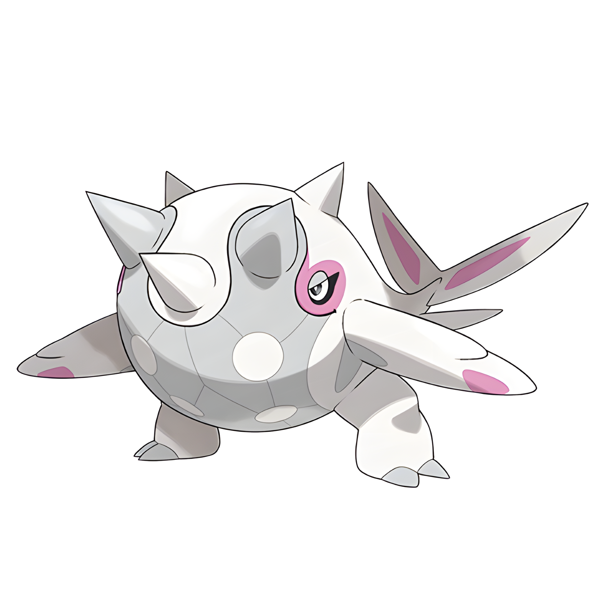 Cetitan is a white whale-like Pokémon. It has a spherical body with five horns protruding from it, two of which are on the top of its head and three of which come from the front of its face. The three protruding from its face are split into a single white horn on its upper jaw and two gray ones on its lower jaw. Its lower jaw is also gray with a white dot pattern that covers its stomach. It has pink highlights that appear around its eyes, fins, and fluke-like tail. It also has two-toed feet.